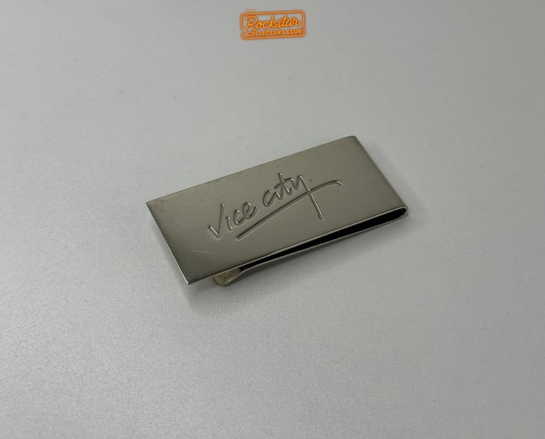 La pince à billets Vice City, vendue sur la boutique Rockstar en 2002, permet de conserver vos billets sans les abîmer. En métal, elle présente une gravure centrale avec l’inscription « Vice City ».