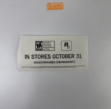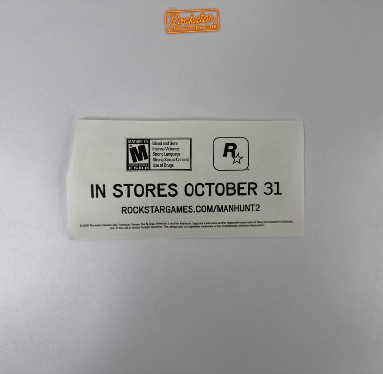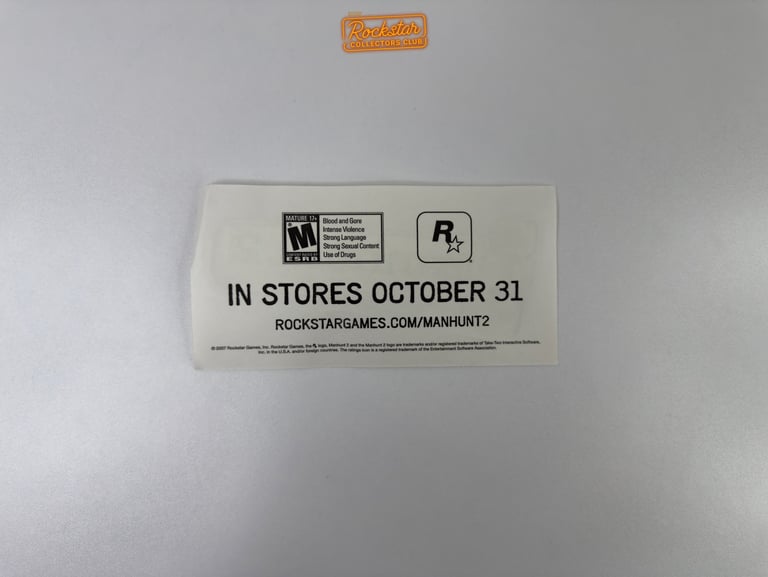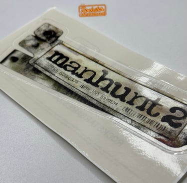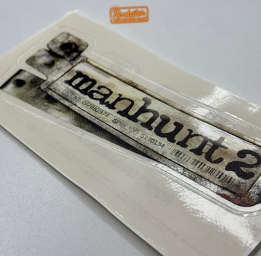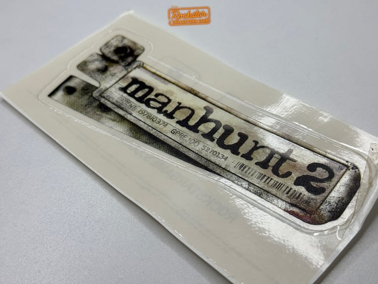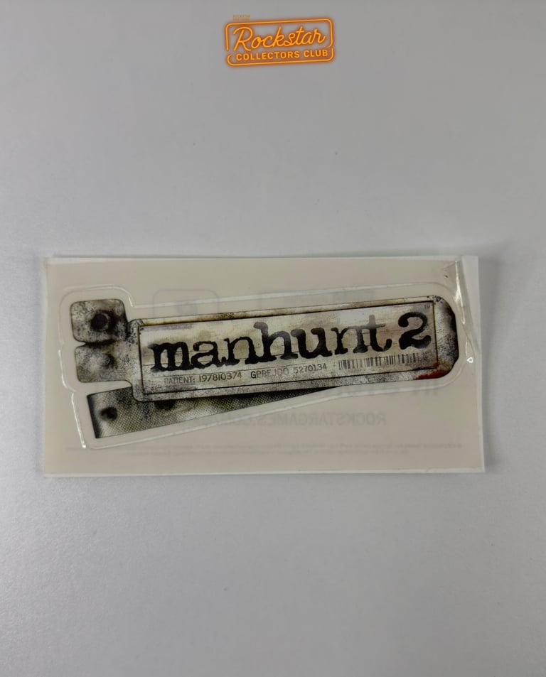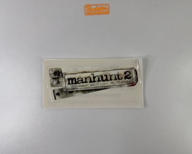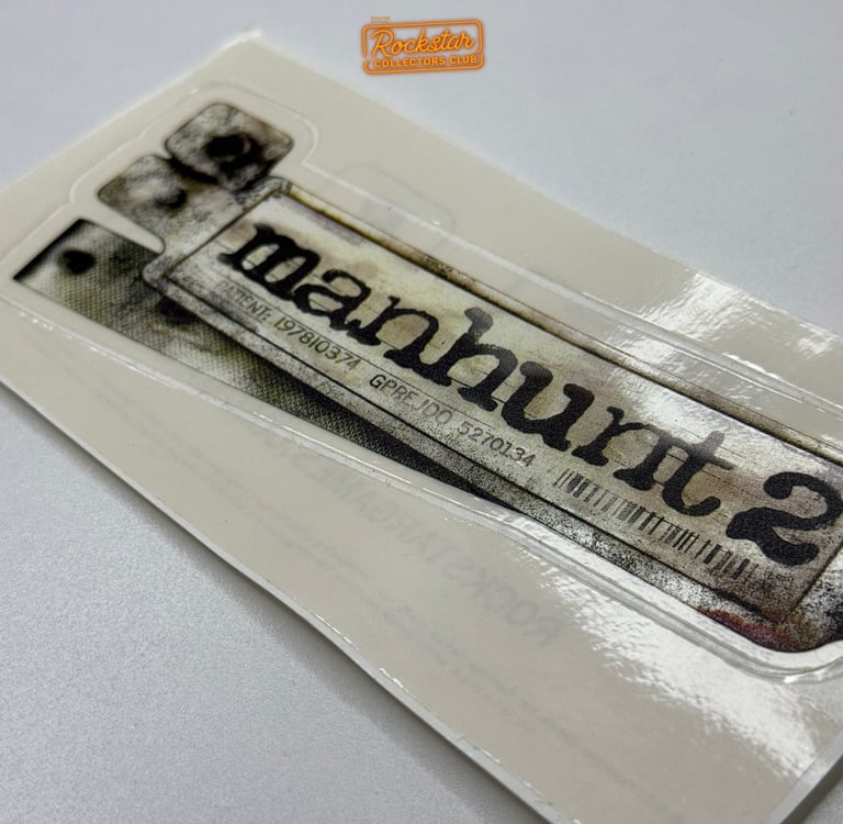 Ce sticker transparent du logo Manhunt 2 faisait partie du kit de presse distribué à la presse et aux magasins de jeux vidéo. Au dos, il comporte la date de sortie du jeu ainsi que l’adresse du site officiel. Il faisait la promotion du jeu avant sa sortie.