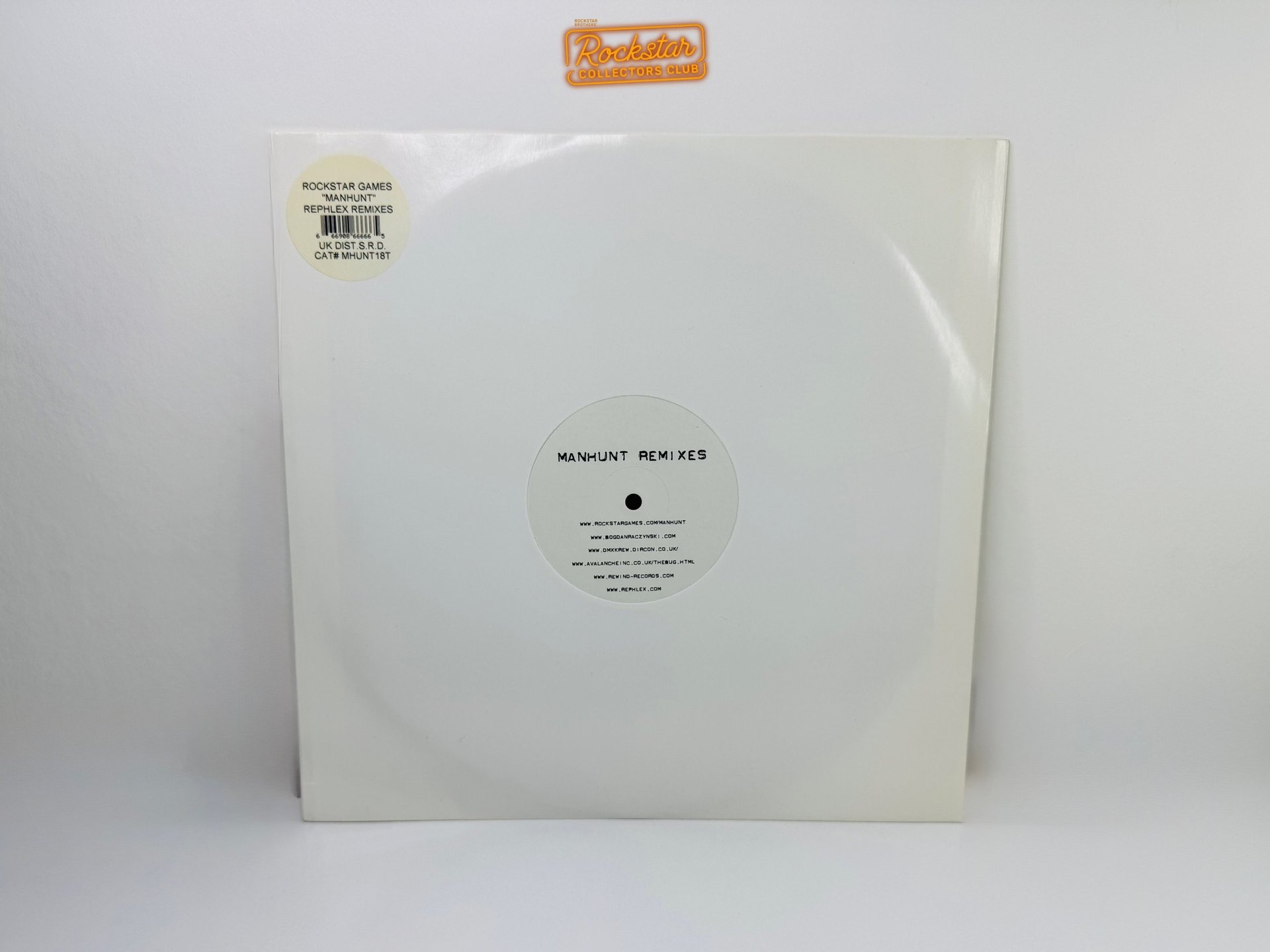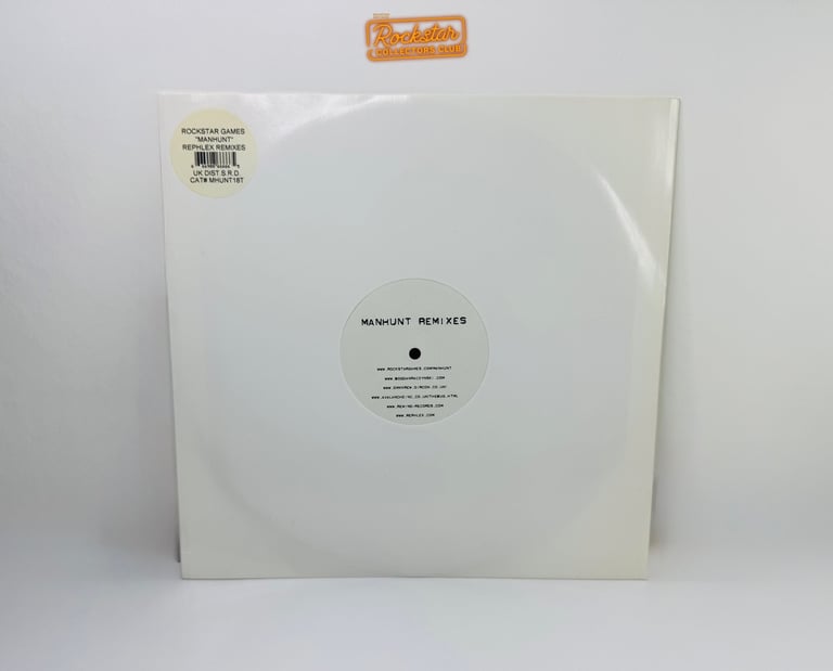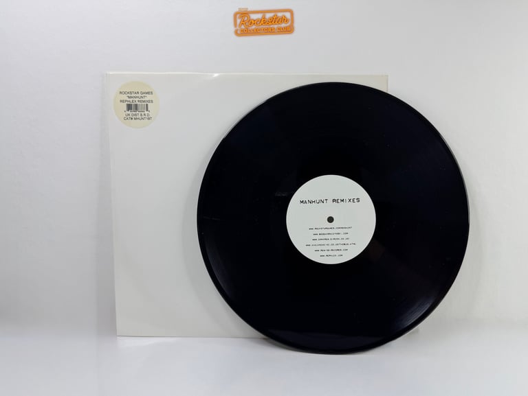 Le vinyle 33 tours de la bande originale de Manhunt, incluant les remixes de Rephlex, arbore un design sobre en noir et blanc.